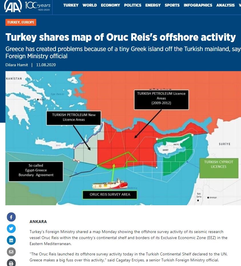 Το υπουργείο Εξωτερικών της γειτονικής χώρας έδωσε στη δημοσιότητα έναν χάρτη, στον οποίο απεικονίζεται η δραστηριότητα της υπεράκτιας έρευνας του σεισμικού ερευνητικού σκάφους Oruc Reis, το οποίο σύμφωνα με το Τουρκικό ΥΠΕΞ πλέει «εντός της υφαλοκρηπίδας της χώρας και στα σύνορα της Αποκλειστικής Οικονομικής Ζώνης (ΑΟΖ) στην Ανατολική Μεσόγειο»!