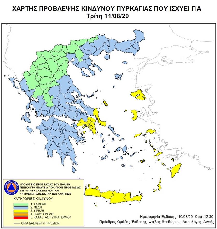 Υψηλός είναι και για σήμερα ο κίνδυνος (κατηγορία 3), εκδήλωσης πυρκαγιάς σε ορισμένες περιοχές της Ελλάδας, σύμφωνα με το Χάρτη Πρόβλεψης Κινδύνου Πυρκαγιάς που εκδίδει η Γενική Γραμματεία Πολιτικής Προστασίας του Υπουργείου Εσωτερικών και Διοικητικής Ανασυγκρότησης.