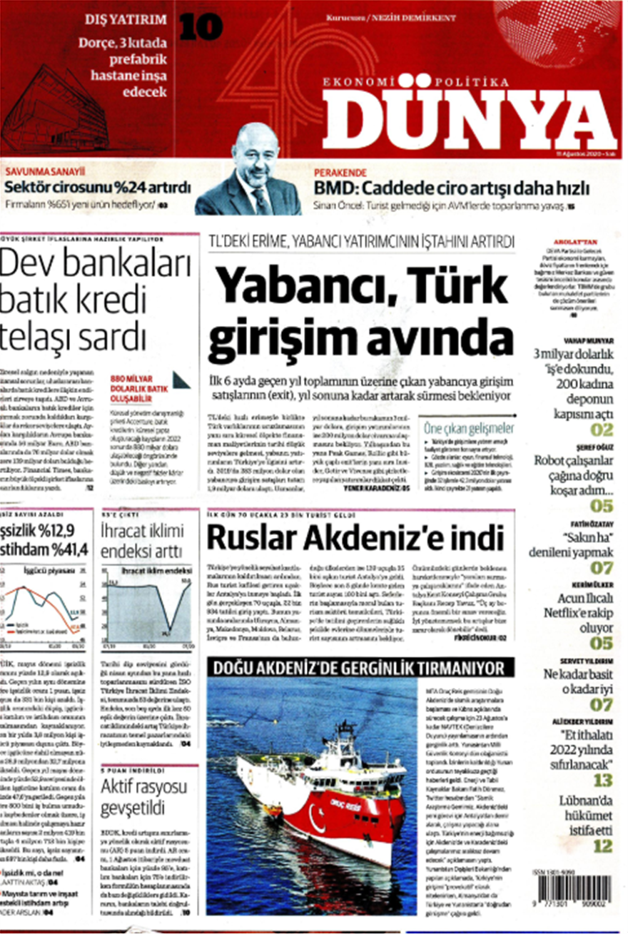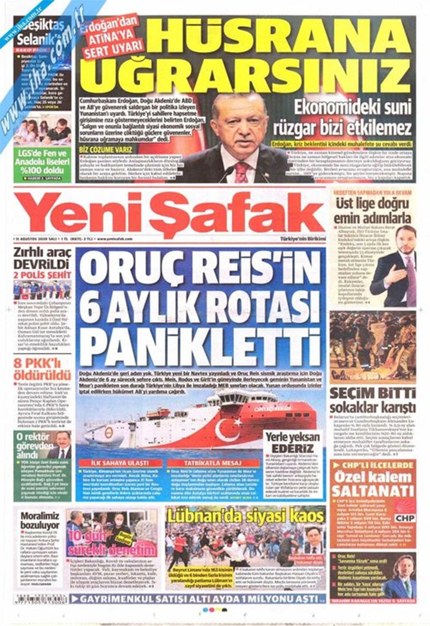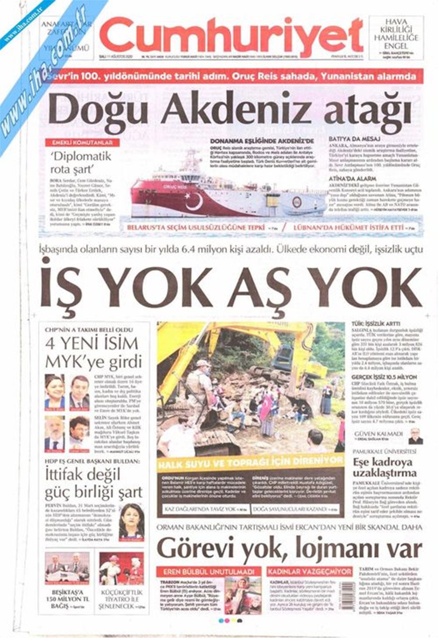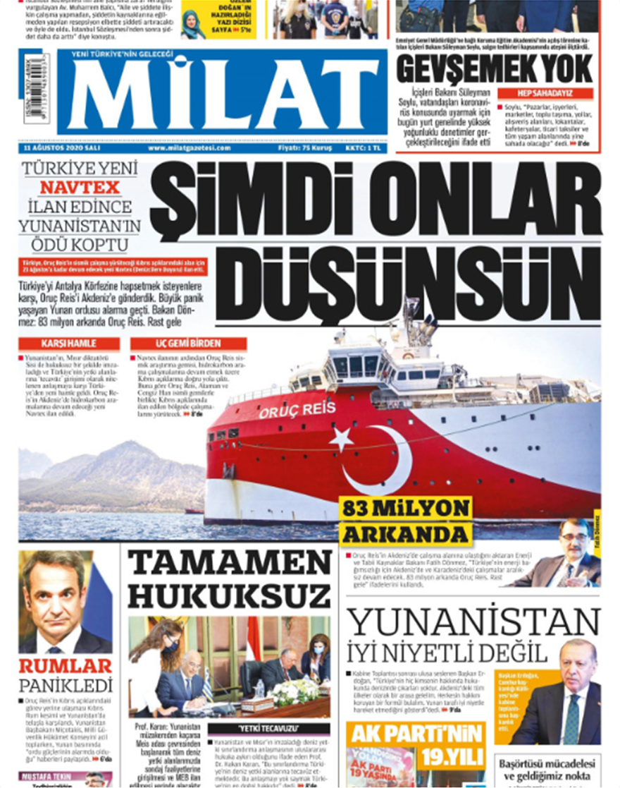 «Ιστορικής σημασίας βήμα στην 100η επέτειο της Συνθήκης των Σεβρών», χαρακτήριζει η εφημερίδα CumHuriyet την «έξοδο» του Oruc Reis, σημειώνοντας «Το Oruc Reis στο μέτωπο, η Ελλάδα σε πανικό».