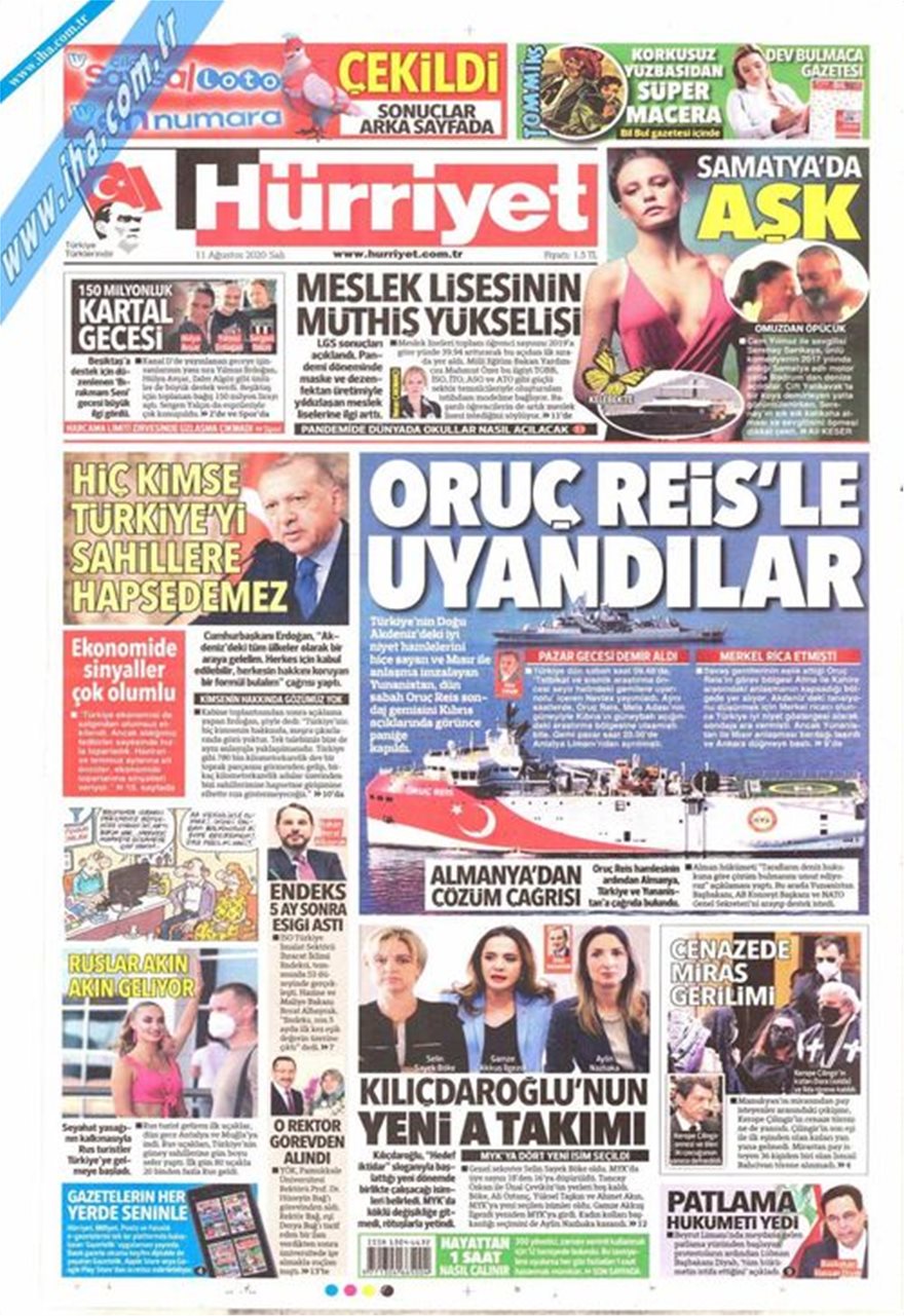 «Η Ελλάδα η οποία αδιαφόρησε για τις κινήσεις καλής θέλησης της Τουρκίας και συμφώνησε με την Αίγυπτο, τώρα πανικοβλήθηκε όταν ξαφνικά είδε το Oruc Reis στα ανοιχτά της Κύπρου. Η Μερκελ είχε ζητήσει να σταματήσουν οι έρευνες ως ένδειξη καλής θέλησης και η Τουρκία είχε σταματήσει. Όμως η Ελλάδα και η Αίγυπτος ξεχείλισαν το ποτήρι και η Άγκυρα πάτησε το κουμπί», γράφει η εφημερίδα Hurriyet.