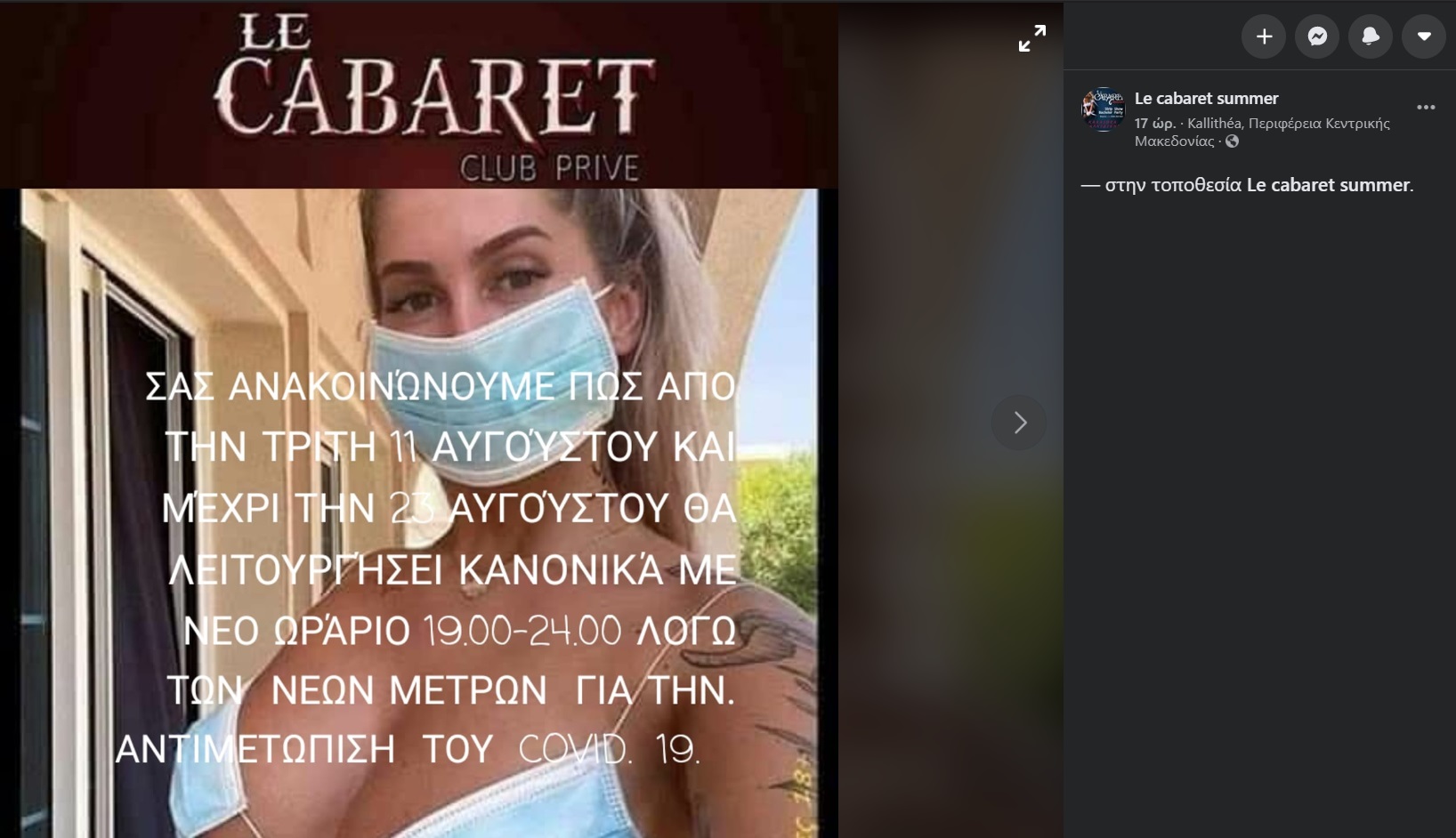 Συγκεκριμένα επιχείρηση στην Χαλκιδική ενημερώνει τους πελάτες της με ανάρτησή της στο Facebook ότι μέχρι τις 23 Αυγούστου αλλάζει το ωράριο λειτουργίας της και θα είναι ανοιχτή από τις 7 το απόγευμα έως τις 12 τα μεσάνυχτα.