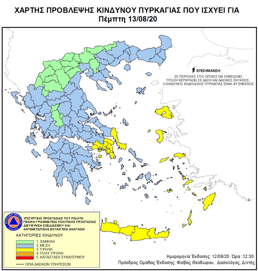 Συγκεκριμένα, σύμφωνα με το Χάρτη Πρόβλεψης Κινδύνου της Γενικής Γραμματείας Πολιτικής Προστασίας, για τις 13 Αυγούστου προβλέπεται υψηλός (κατηγορία 3) κίνδυνος φωτιάς στις εξής περιοχές: