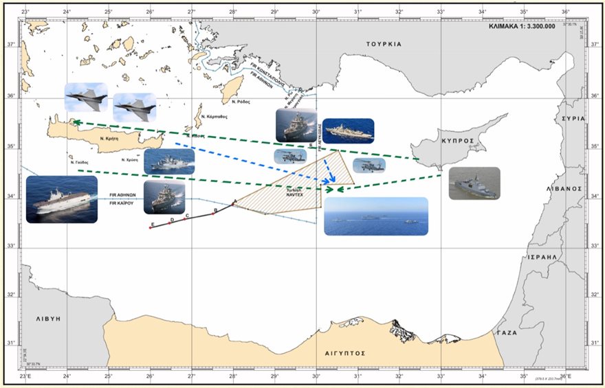 Στον χάρτη φαίνεται πώς κινήθηκαν τα ελληνικά και γαλλικά πολεμικά πλοία αλλά και πώς πέταξαν τα ελληνικά ελικόπτερα και τα δύο γαλλικά Raphale που συμμετείχαν στην άσκηση.