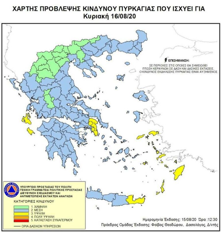 Σύμφωνα με το Χάρτη Πρόβλεψης Κινδύνου Πυρκαγιάς που εκδίδει η Γενική Γραμματεία Πολιτικής Προστασίας του Υπουργείου Προστασίας του Πολίτη, προβλέπεται υψηλός κίνδυνος πυρκαγιάς (κατηγορία κινδύνου 3) σε Αττική, Κεφαλλονιά, Ζάκυνθο, Λασίθι, Σάμο, Ικαρία και Δωδεκάνησα.