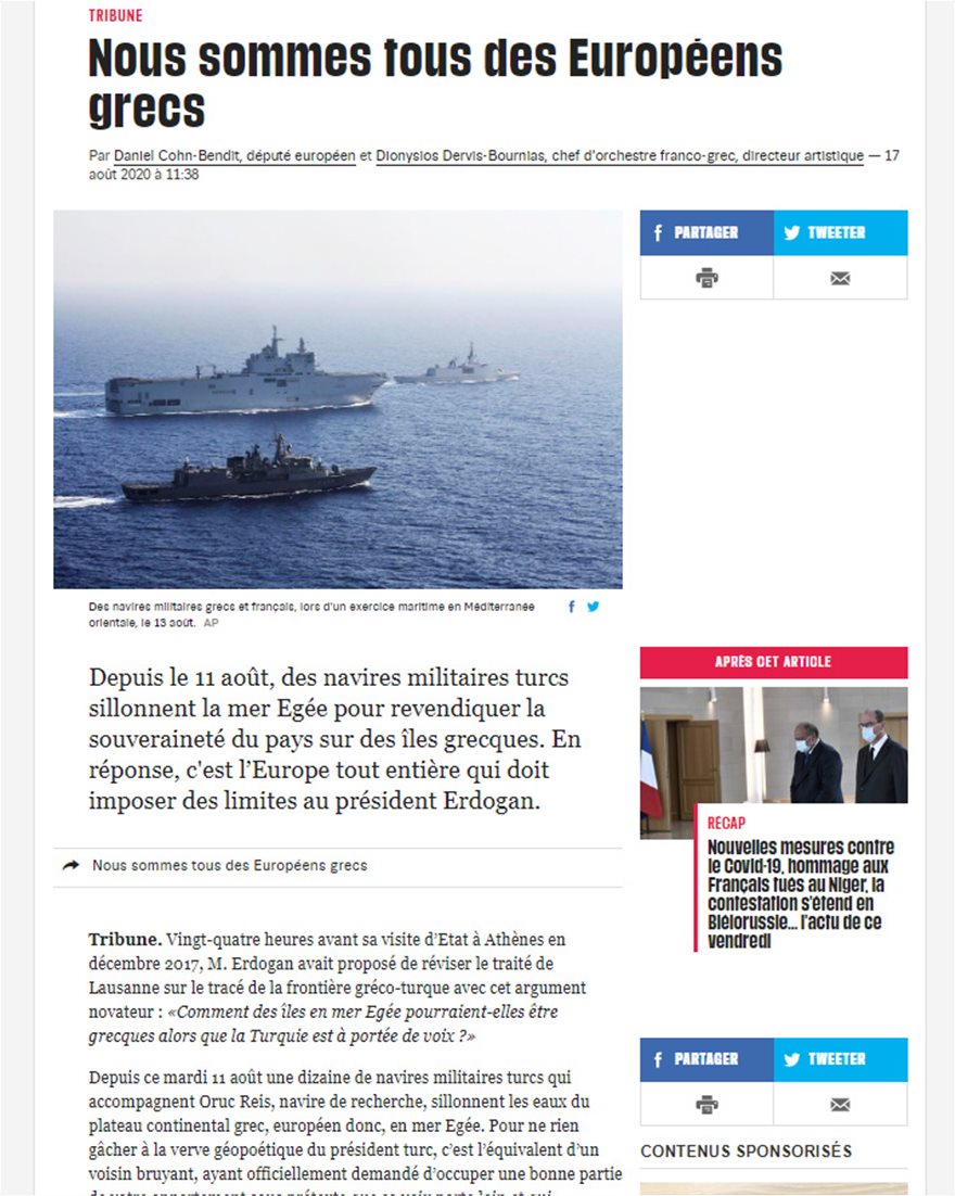 Με τίτλο «Είμαστε όλοι Έλληνες Ευρωπαίοι» ο ευρωβουλευτής Daniel Cohn-Bendit, Ευρωβουλευτή και ο διευθυντής της ελληνογαλλικής ορχήστρας Διονύσης Δερβιτσιώτης-Μπουρνιάς αποδομούν τα επιχειρήματα Ερντογάν, χαρακτηριζουν τη στήριξη Μακρόν στην Ελλάδα ως κίνηση που «έσωσε την τιμή της Ευρώπης» και καλούν τη Γερμανία να πάρει θέση.