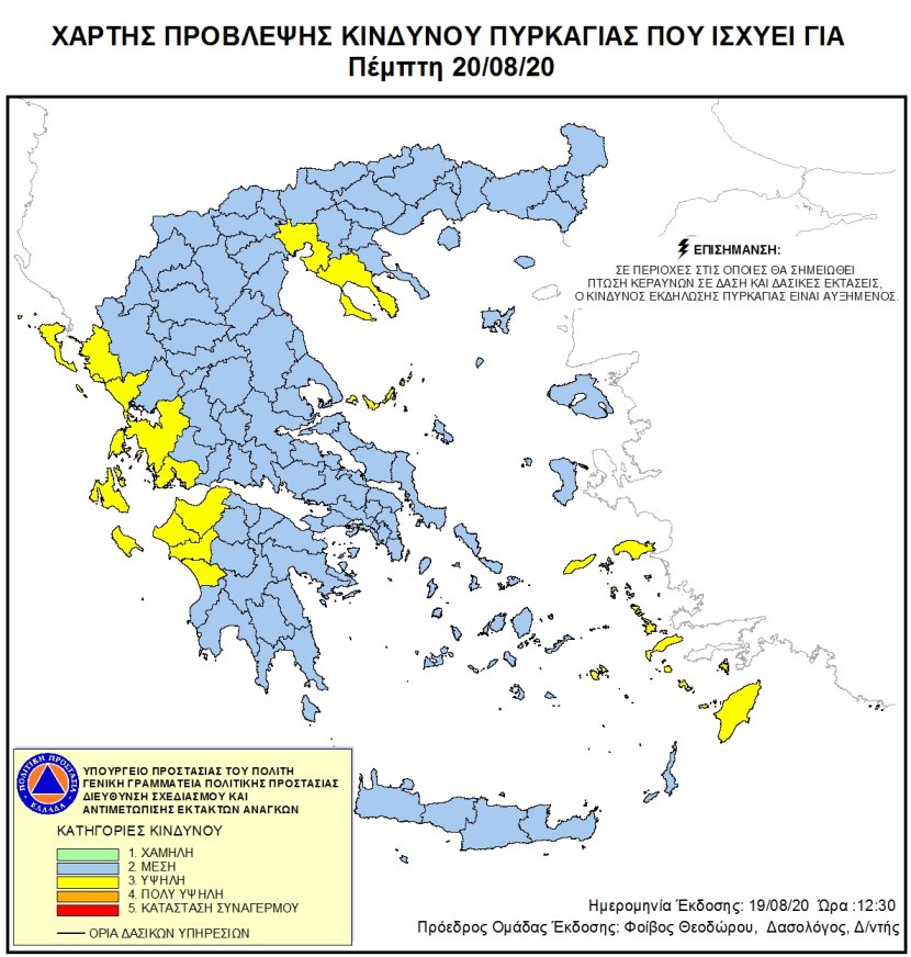 Συγκεκριμένα, σύμφωνα με το Χάρτη Πρόβλεψης Κινδύνου της Γενικής Γραμματείας Πολιτικής Προστασίας, για τις 20 Αυγούστου προβλέπεται υψηλός (κατηγορία 3) κίνδυνος φωτιάς στις εξής περιοχές: