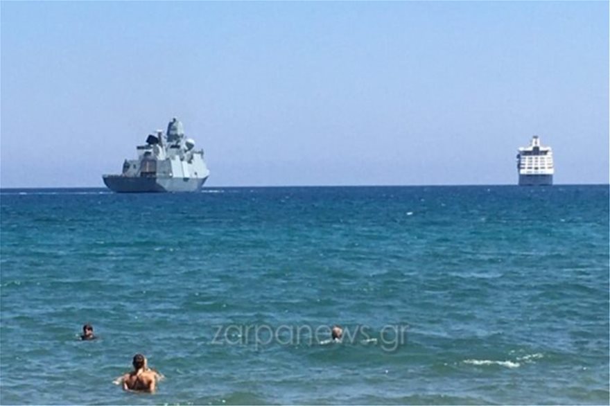 Η φρεγάτα και το κρουαζιερόπλοιο ήταν αρόδο και στην ακτή οι λουόμενοι, συνθέτοντας ένα όχι και τόσο συνηθισμένο – και καθόλου ευχάριστο – σκηνικό.