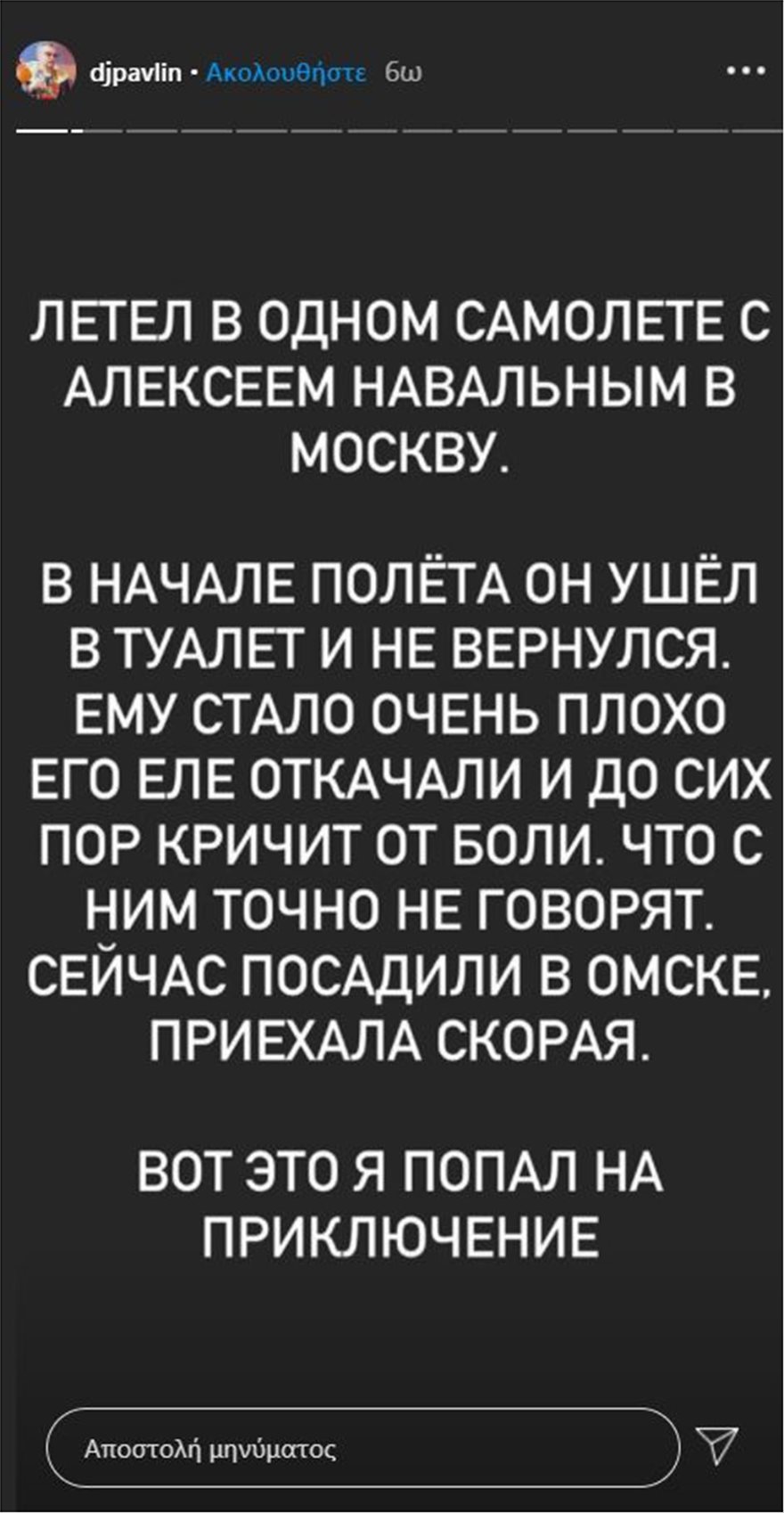 Την εκδοχή αυτή υποστηρίζει φωτογραφία που ανήρτησε στο Instagram ένας συνταξιδιώτης του Ναβάλνι στην επίμαχη πτήση. Στη συνέχεια, στο story που ανέβασε, εξηγεί ότι ο Ναβάλνι πήγε στην τουαλέτα λίγη ώρα μετά την απογείωση και δεν γύρισε ποτέ πίσω στη θέση του. Άρχισε να αισθάνεται ποολύ άσχημα και το πλήρωμα προσπάθησε να τον βοηθήσει αλλά εκείνος κραύγαζε από τον πόνο, γράφει στο story του ο Λεμπέντεβ.