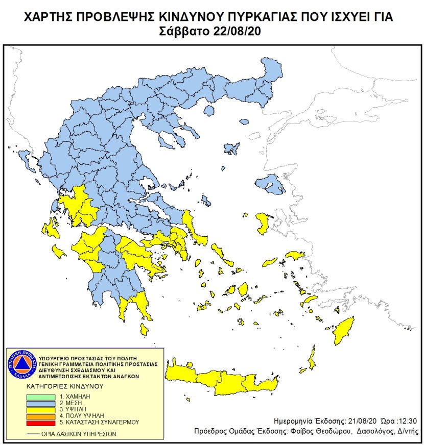 Συγκεκριμένα, σύμφωνα με το Χάρτη Πρόβλεψης Κινδύνου της Γενικής Γραμματείας Πολιτικής Προστασίας, για τις 22 Αυγούστου προβλέπεται υψηλός (κατηγορία 3) κίνδυνος φωτιάς στις εξής περιοχές: