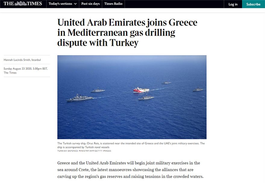 Oι Times του Λονδίνου έδωσαν στην δημοσιότητα ένα άρθρο για την κατάσταση στην Ανατολική Μεσόγειο και αναφέρθηκε ότι η Ελλάδα και τα ΗΑΕ θα ξεκινήσουν κοινές στρατιωτικές ασκήσεις, κίνηση ενδεικτική των συμμαχιών που δημιουργούνται με φόντο τα αποθέματα φυσικού αερίου στην περιοχή.