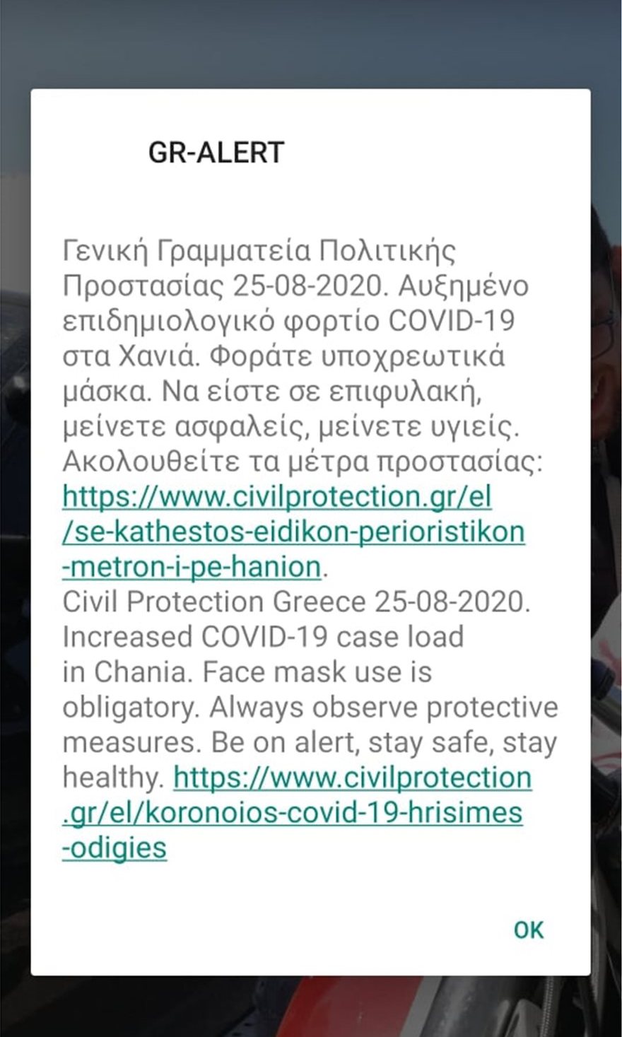 Με αφορμή τον ολοένα και αυξανόμενο αριθμό νέων κρουσμάτων στην πόλη η Γενική Γραμματεία Πολιτικής Προστασίας έστειλε και μήνυμα στα κινητά τηλέφωνα των πολιτών, μέσω του 112, στο οποίο αναφέρει: «Φοράτε υποχρεωτικά μάσκα. Να είστε σε επιφυλακή, μείνετε ασφαλείς, μείνετε υγιείς».
