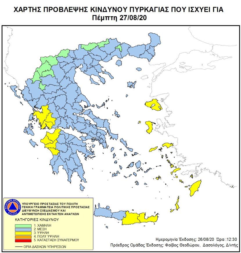 Σε αρκετές περιοχές της χώρας ο κίνδυνος εκδήλωσης πυρκαγιάς την Πέμπτη, 27 Αυγούστου, είναι υψηλός λόγω των ανέμων και των μεγάλων θερμοκρασιών.
