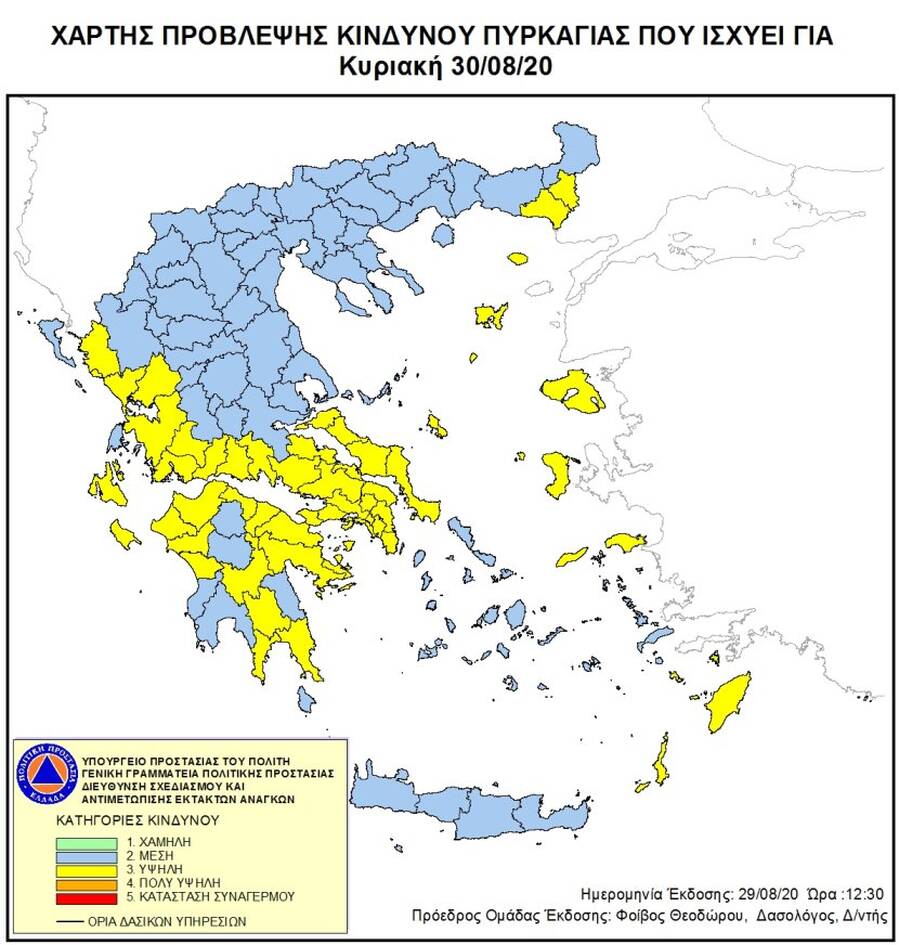 Σήμερα Κυριακή 30 Αυγούστου, σύμφωνα με το Χάρτη Πρόβλεψης Κινδύνου Πυρκαγιάς που εκδίδει η Γενική Γραμματεία Πολιτικής Προστασίας του Υπουργείου Εσωτερικών και Διοικητικής Ανασυγκρότησης, προβλέπεται υψηλός κίνδυνος πυρκαγιάς (κατηγορίας 3), σε ορισμένες περιοχές της Ελλάδας.