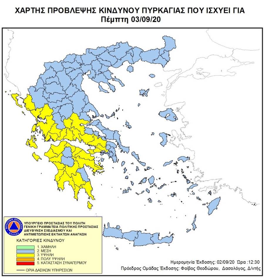 Για σήμερα Πέμπτη 3 Σεπτεμβρίου, σύμφωνα με το Χάρτη Πρόβλεψης Κινδύνου Πυρκαγιάς που εκδίδει η Γενική Γραμματεία Πολιτικής Προστασίας του Υπουργείου Εσωτερικών και Διοικητικής Ανασυγκρότησης, προβλέπεται υψηλός κίνδυνος πυρκαγιάς (κατηγορίας 3), για ορισμένες περιοχές της χώρα μας.