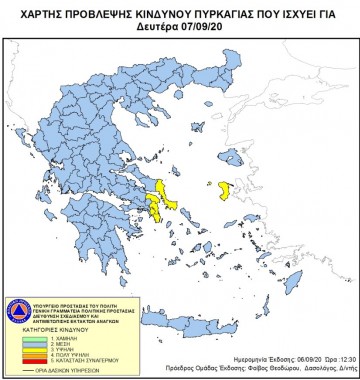 Για αύριο Δευτέρα 7 Σεπτεμβρίου, σύμφωνα με τον Χάρτη Πρόβλεψης Κινδύνου Πυρκαγιάς της Γενικής Γραμματείας Πολιτικής Προστασίας προβλέπεται υψηλός κίνδυνος πυρκαγιάς (κατηγορίας 3) σε ορισμένες περιοχές της Αττικής, της Εύβοιας & στη Χίο.