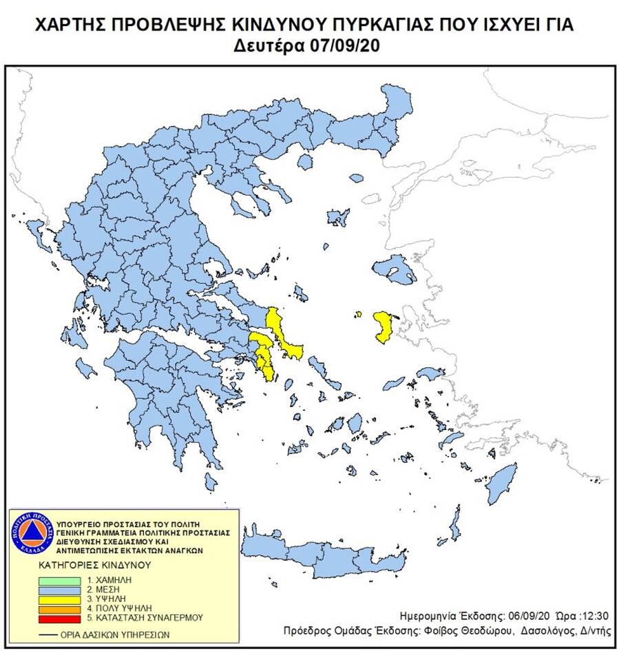 Για σήμερα Δευτέρα 7 Σεπτεμβρίου, σύμφωνα με το Χάρτη Πρόβλεψης Κινδύνου Πυρκαγιάς που εκδίδει η Γενική Γραμματεία Πολιτικής Προστασίας του Υπουργείου Εσωτερικών και Διοικητικής Ανασυγκρότησης, προβλέπεται υψηλός κίνδυνος πυρκαγιάς (κατηγορίας 3), σε ορισμένες περιοχές της Ελλάδας.