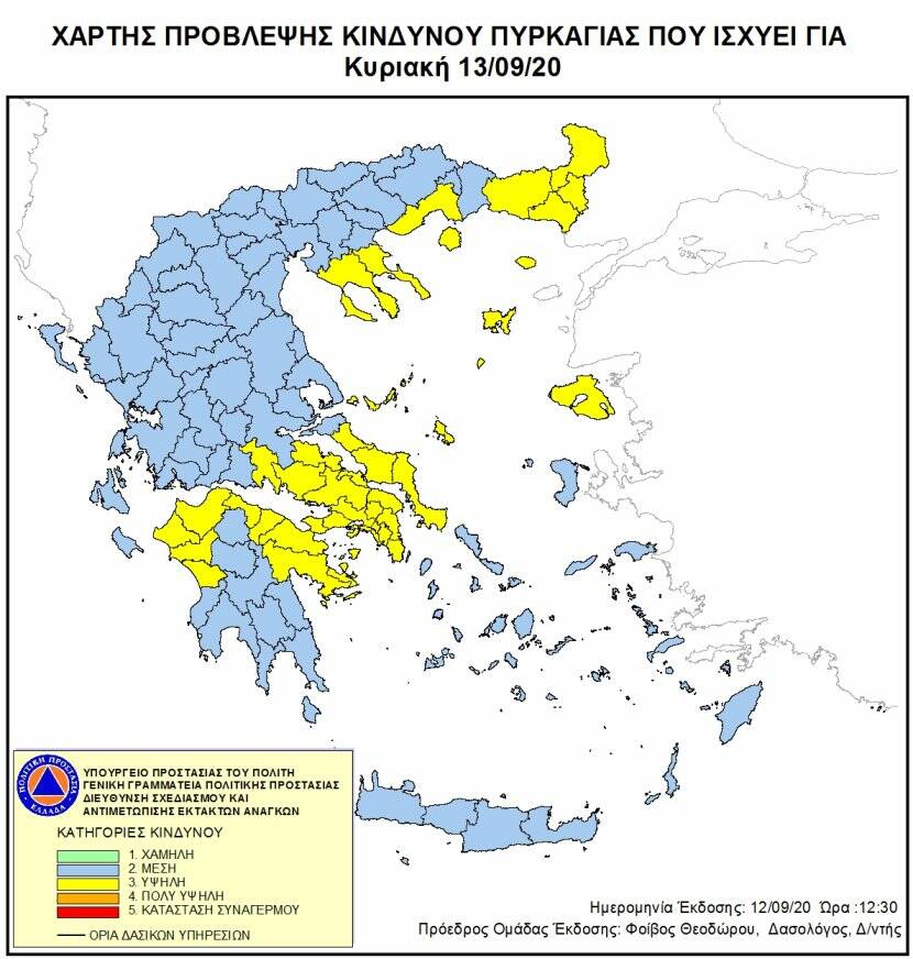Σύμφωνα με το Χάρτη Πρόβλεψης Κινδύνου Πυρκαγιάς που εκδίδει η Γενική Γραμματεία Πολιτικής Προστασίας του Υπουργείου Προστασίας του Πολίτη, προβλέπεται υψηλός κίνδυνος πυρκαγιάς (κατηγορία κινδύνου 3) σε Αττική, περιοχές Στερεάς Ελλάδας , περιοχές Πελοποννήσου(Αργολίδα, Κορινθία, Αχαία. Ηλεία), Χαλκιδική, Ανατολική Μακεδονία & Θράκη και νησιά Βορείου Αιγαίου.