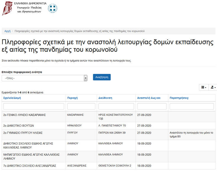 Στο υπουργείο έχει δημιουργήσει μία λίστα, η οποία και ανανεώνεται ανάλογα με τις εξελίξεις, όπου καταγράφονται τα σχολεία στα οποία εμφανίζονται κρούσματα κορωνοϊού.