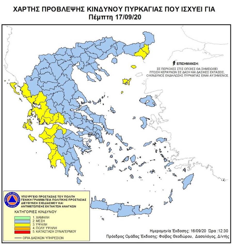 Για σήμερα Πέμπτη 17 Σεπτεμβρίου, σύμφωνα με το Χάρτη Πρόβλεψης Κινδύνου Πυρκαγιάς που εκδίδει η Γενική Γραμματεία Πολιτικής Προστασίας του Υπουργείου Εσωτερικών και Διοικητικής Ανασυγκρότησης, προβλέπεται υψηλός κίνδυνος πυρκαγιάς (κατηγορίας 3), σε ορισμένες περιοχές της Ελλάδας.