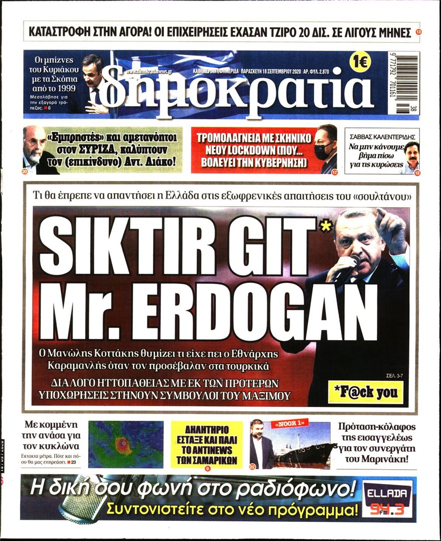 Με ανακοίνωσή του το υπουργείο Εξωτερικών, καταδίκασε το σημερινό πρωτοσέλιδο της εφημερίδας «Δημοκρατία», κατά το οποίο χρησιμοποίησε προσβλητικούς χαρακτηρισμούς για τον Ρετζέπ Ταγίπ Ερντογάν, και κατέστησε σαφές ότι δεν… ανέχεται να βρίζουν οι Έλληνες τον Τούρκο Πρόεδρο.