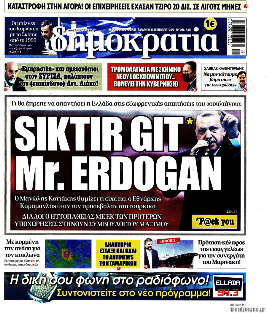 ▪️Turkish Foreign Ministry summoned the Greek ambassador over headline. pic.twitter.com/hyb9APatHR— EHA News (@eha_news) September 19, 2020