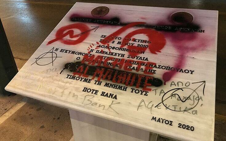 Άγνωστοι βανδάλισαν με σπρέι το μνημείο των νεκρών της Marfin (φώτο)