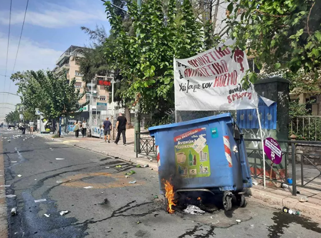 Η περιοχή θυμίζει «πεδίο» μάχης, με άλλους κάδους να φλέγονται κι άλλους να είναι πεταμένοι στο έδαφος.