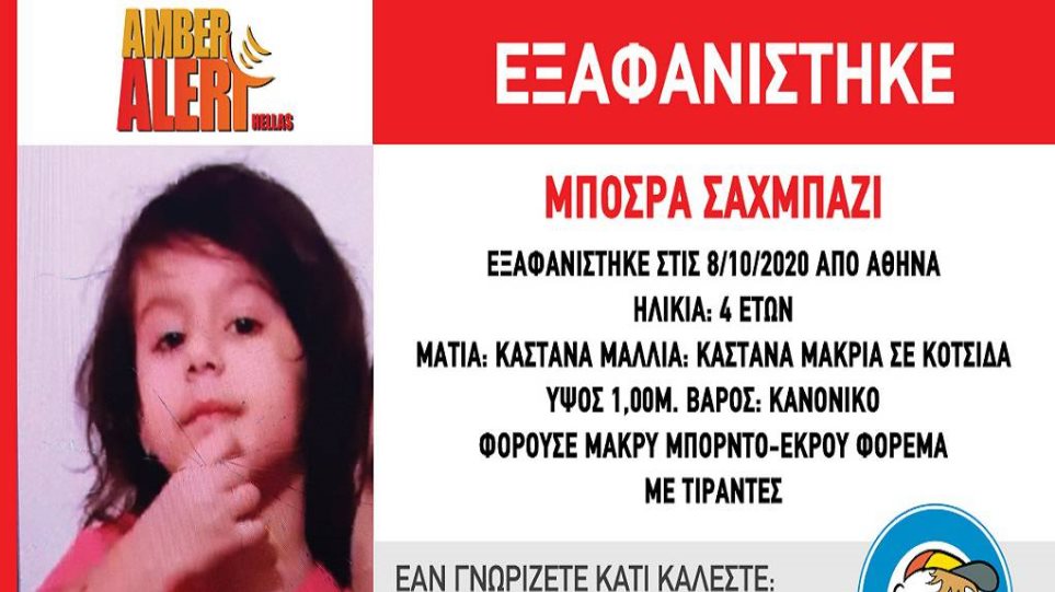 Σύμφωνα με την ανακοίνωση που εξέδωσε το «Χαμόγελο του Παιδιού», η 4χρονη που εξαφανίστηκε στην Αθήνα ονομάζεται Μπόσρα Σαχμπάζι. Εξαφανίστηκε στις 11.30 το πρωί της Πέμπτης 8 Οκτωβρίου 2020. Η 4χρονη είναι αφγανικής καταγωγής.