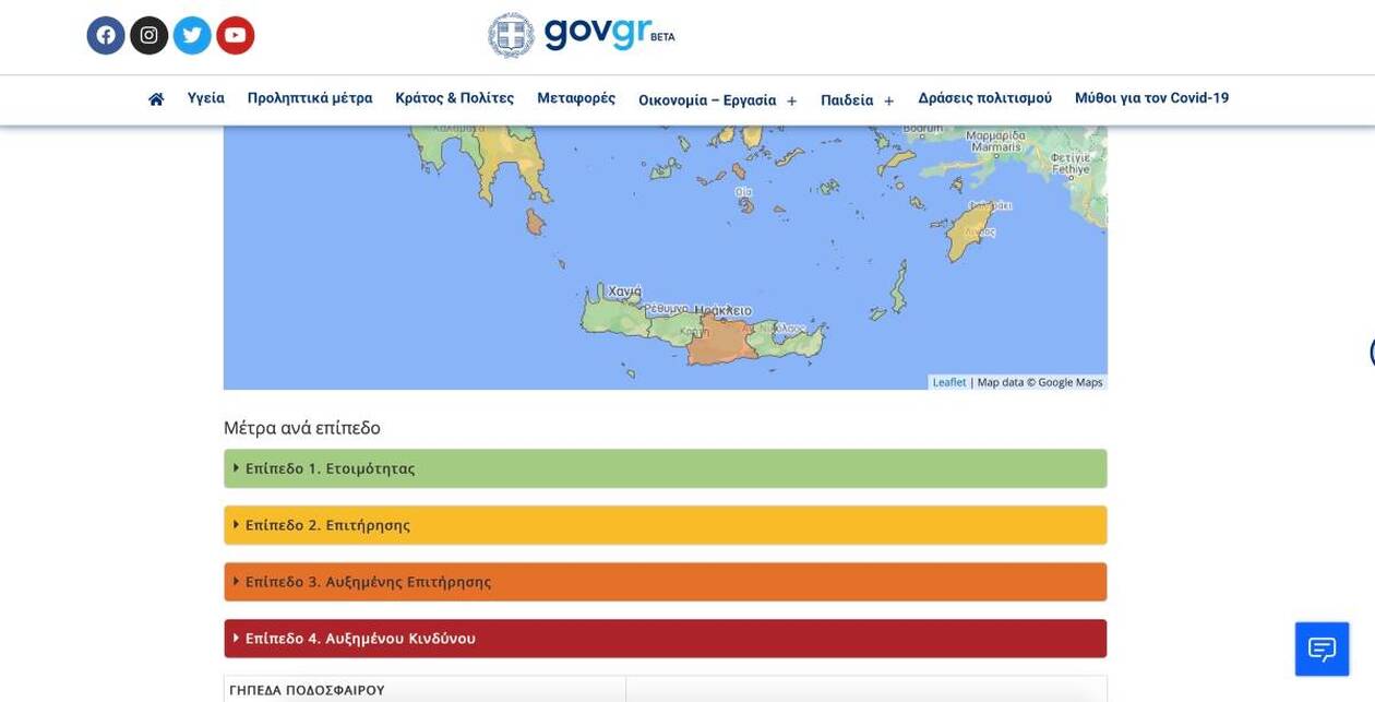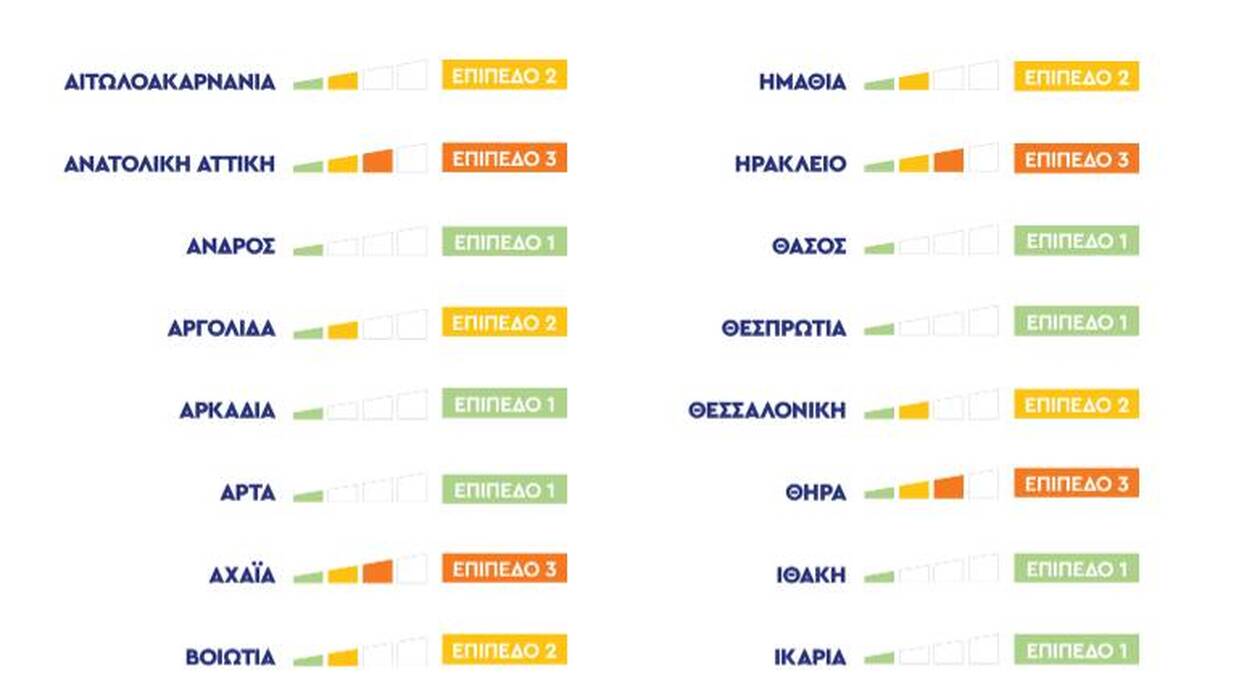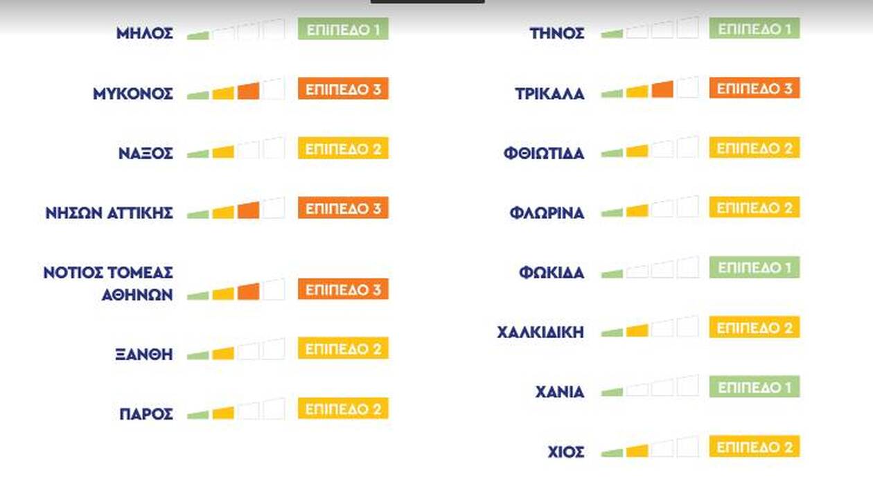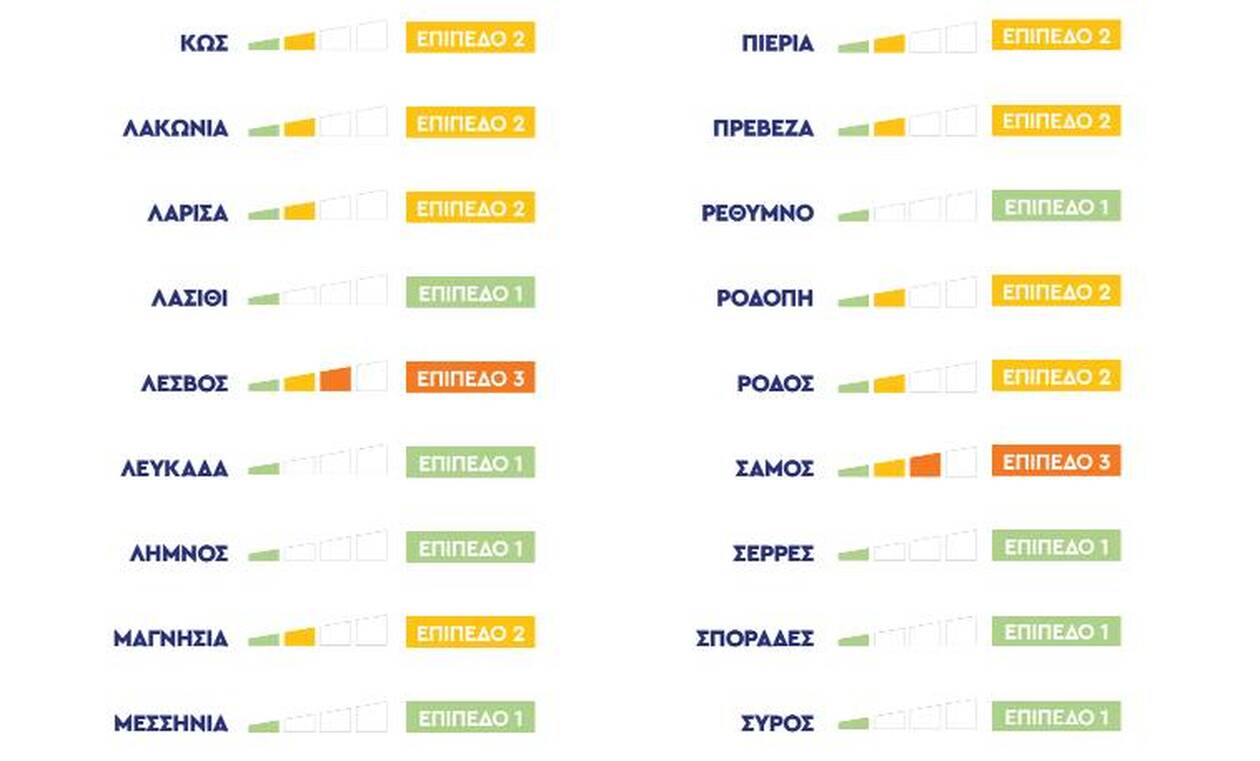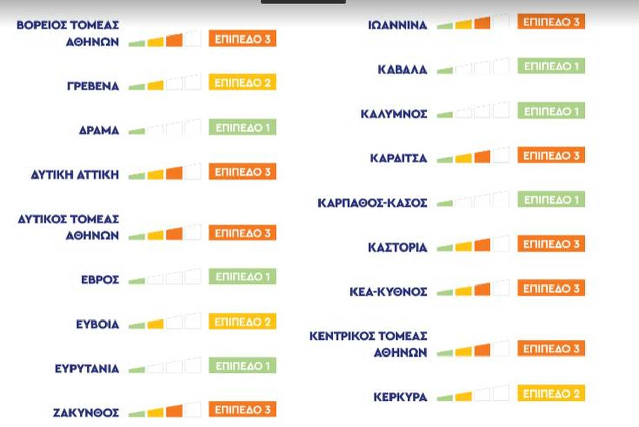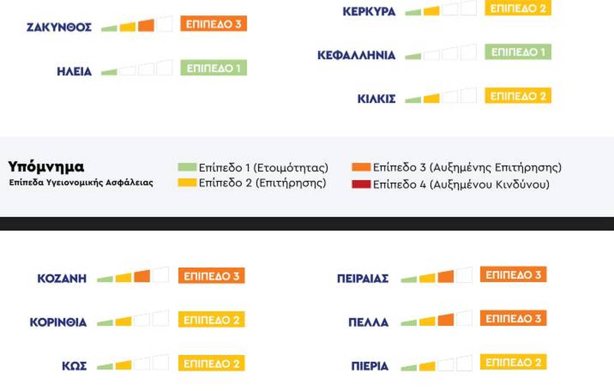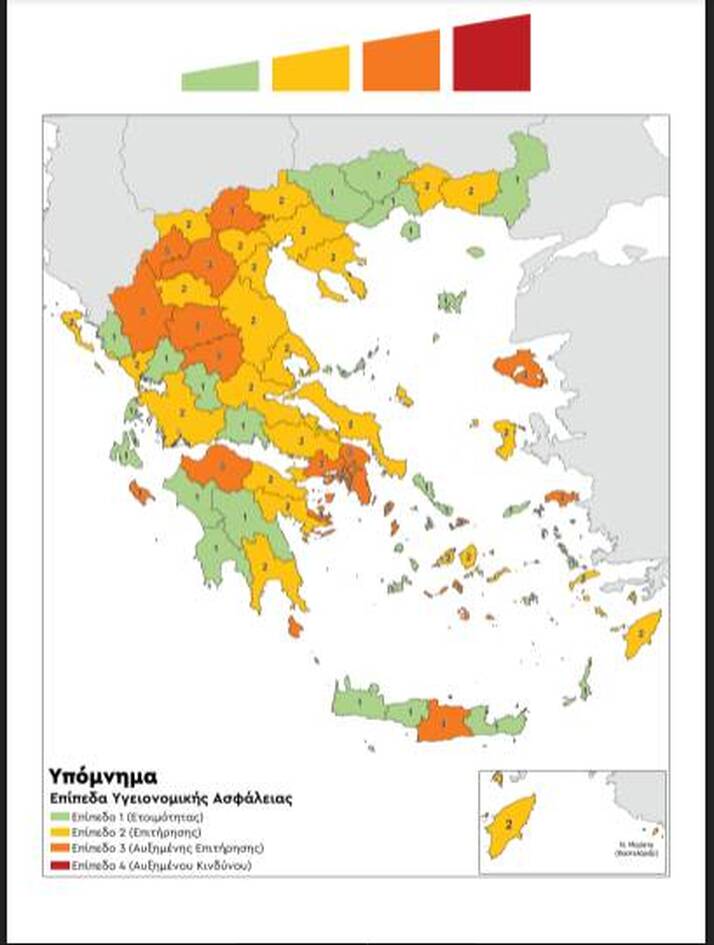 Ο χάρτης υγειονομικής ασφάλειας και προστασίας από τον κορωνοϊό περιλαμβάνει 4 επίπεδα προληπτικών μέτρων και κανόνων για κάθε περιφερειακή ενότητα της χώρας: