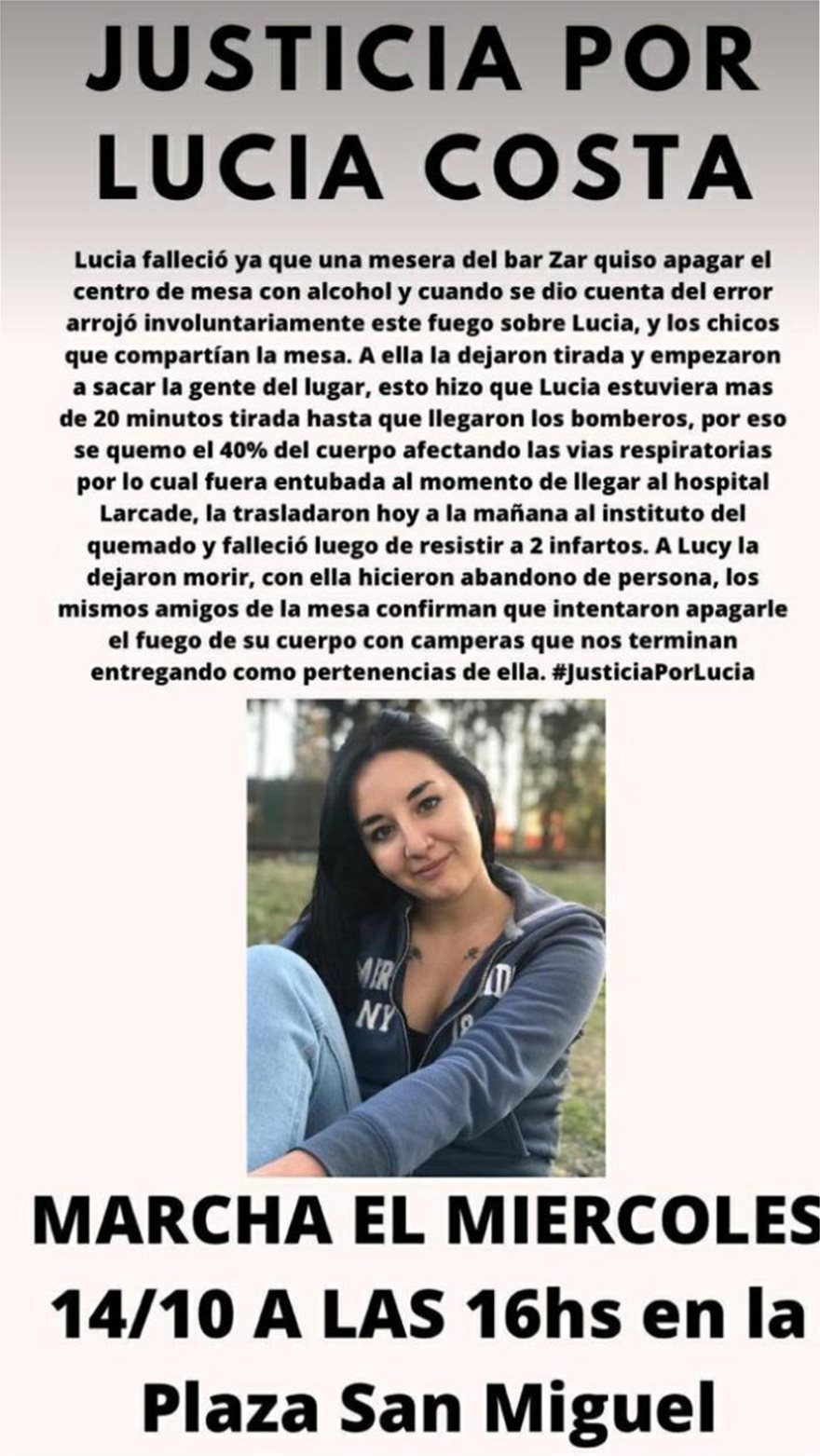 Ο πατέρας του άτυχου κοριτσιού, Πάμπλο Κόστα, είπε στην τηλεόραση του C5N ότι η κόρη του πέρασε δύο ώρες μέσα στο εστιατόριο πριν από την έκρηξη και το τραγικό της υπόθεσης ήταν ότι η Λουτσία απολάμβανε την πρώτη της νύχτα με φίλους μετά από σχεδόν 6 μήνες λόγω της πανδημίας του κορωνοϊου.