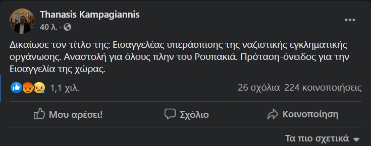 «Δικαίωσε τον τίτλο της: Εισαγγελέας υπεράσπισης της ναζιστικής εγκληματικής οργάνωσης. Αναστολή για όλους πλην του Ρουπακιά. Πρόταση-όνειδος για την Εισαγγελία της χώρας».