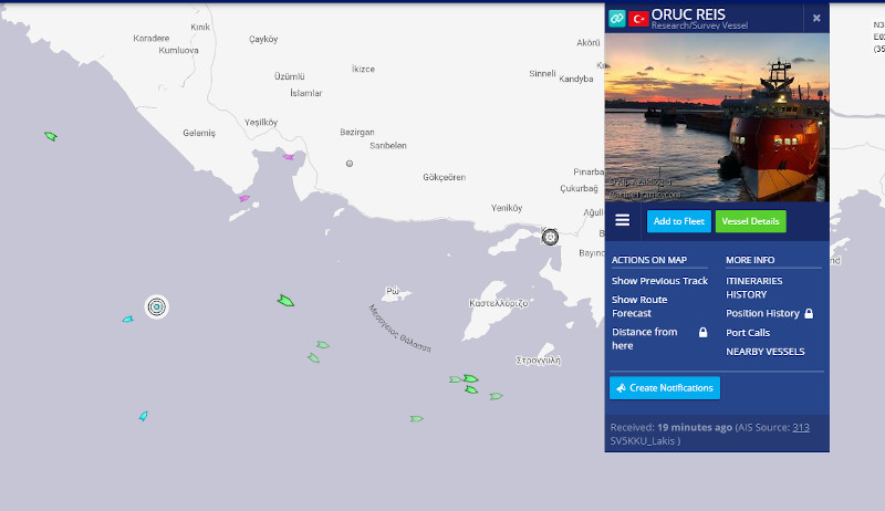 Το βράδυ της Τετάρτης το τουρκικό ερευνητικό σκάφος ήταν σε απόσταση 30-35 ν.μ. από το ελληνικό νησί. Λίγο πριν από τα μεσάνυχτα, το Oruc Reis έκανε νέα στροφή, όπως προκύπτει από το στίγμα του στο marinetraffic, και εκινείτο προς τα δυτικά με μικρή ταχύτητα.