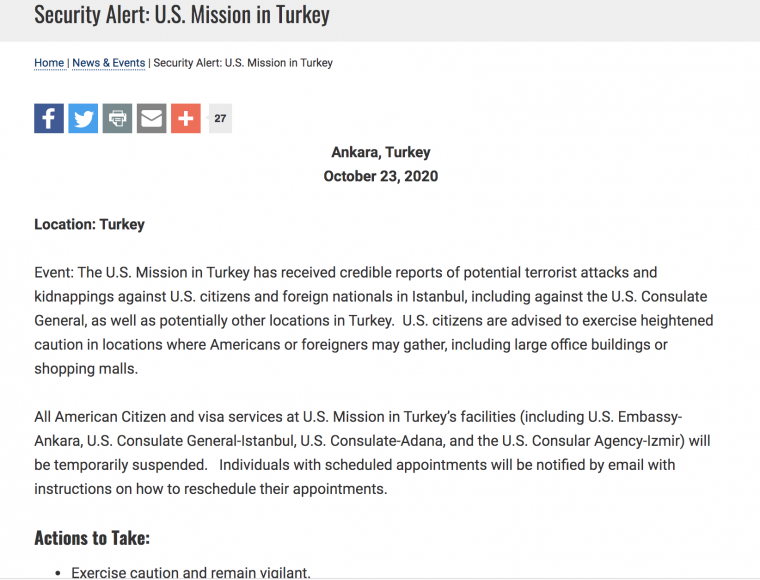«Η Πρεσβεία των ΗΠΑ στην Τουρκία έχει λάβει αξιόπιστες αναφορές για πιθανές τρομοκρατικές επιθέσεις και απαγωγές εναντίον πολιτών των ΗΠΑ και αλλοδαπών υπηκόων στην Κωνσταντινούπολη. Αυτές οι επιθέσεις μπορεί να γίνουν στο Γενικό Προξενείο των ΗΠΑ, καθώς και σε άλλες τοποθεσίες στην Τουρκία», ανέφερε η πρεσβεία σε δήλωση.