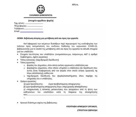 Ο υπάλληλος οφείλει να φέρει υποχρεωτικά μαζί του την αστυνομική του ταυτότητα ή διαβατήριο, καθώς και τη βεβαίωση κίνησης, σε έντυπη ή σε ηλεκτρονική μορφή.