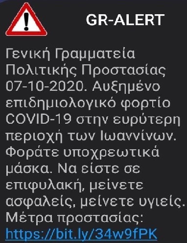 Σήμερα (29/10) τέθηκαν σε ισχύ τα νέα μέτρα στα Ιωάννινα και η Γενική Γραμματεία Πολιτικής Προστασίας απέστειλε μήνυμα προς τους κατοίκους της περιοχής.