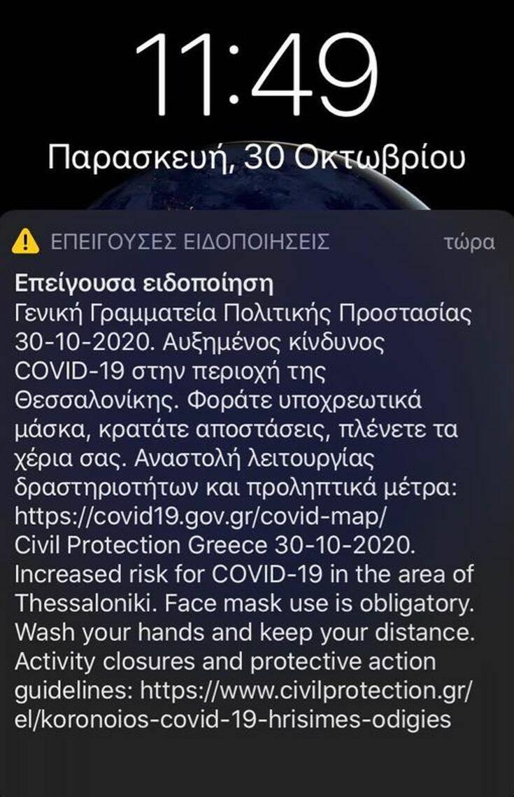 Το μήνυμα από το 112 κάνει λόγο για αυξημένο κίνδυνο κορωνοϊού στην περιοχή της Θεσσαλονίκης και απευθύνει έκκληση στους πολίτες να φορούν μάσκα, να κρατούν αποστάσεις και να πλένουν τα χέρια τους.