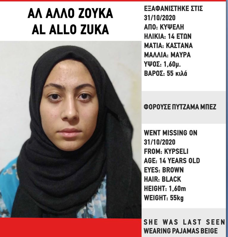 Συναγερμός έχει σημάνει στις αρμόδιες Αρχές, καθώς στις 31/10/2020, εξαφανίστηκε από την περιοχή της Κυψέλης, στην Αθήνα, η Ζούκα (ον.) Αλ Άλλο (επ.), 14 ετών.