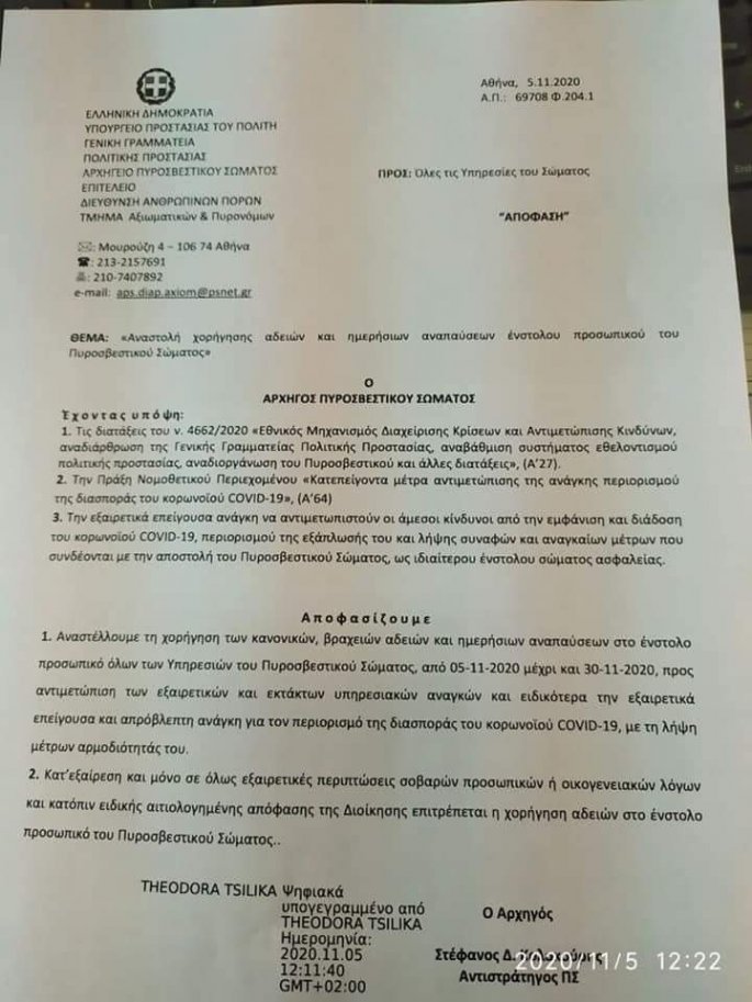 «Αναστέλλουμε τη χορήγηση των κανονικών αδειών, βραχειών αδειών και ημερήσιων αναπαύσεων στο ένστολο προσωπικό όλων των υπηρεσιών του Πυροσβεστικού Σώματος, από 5-11-2020 μέχρι και 30-11-2020, προς αντιμετώπιση των εξαιρετικών και έκτακτων αναγκών και ειδικότερα την εξαιρετικά επείγουσα και απρόβλεπτη ανάγκη για τον περιορισμό της διασποράς του Covid-19, με τη λήψη μέτρων αρμοδιότητάς του. Κατ’ εξαίρεση και μόνο σε όλως εξαιρετικές περιπτώσεις σοβαρών προσωπικών ή οικογενειακών λόγων και κατόπιν ειδικής αιτιολογημένης απόφασης της Διοίκησης επιτρέπεται η χορήγηση αδειών στο ένστολο προσωπικό του Πυροσβεστικού Σώματος».