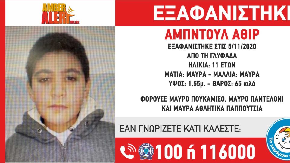 Την Πέμπτη 5/11 εξαφανίστηκε από την Γλυφάδα ο 11χρονος Αμπντούλ Αθίρ, που δεν έχει δώσει σημάδια ζωής μέχρι στιγμής.