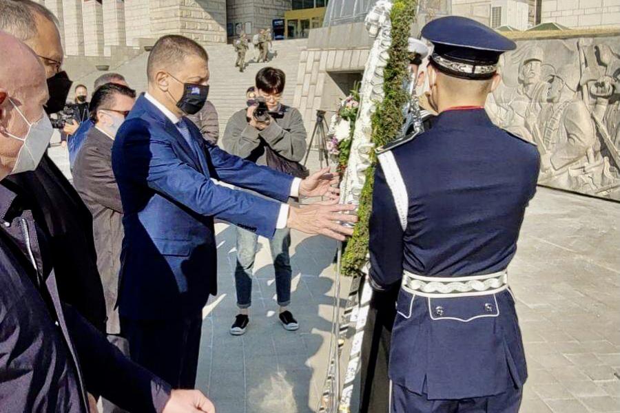 Όπως ανακοινώθηκε, παρά τις εξαιρετικά δύσκολες συνθήκες παγκοσμίως, τους ταξιδιωτικούς περιορισμούς και τους αυστηρότατους υγειονομικούς ελέγχους, ο υφυπουργός Εθνικής Άμυνας εκπροσώπησε την Ελλάδα προκειμένου να αποτίσει φόρο τιμής στους 196 Έλληνες πεσόντες ήρωες και στο σύνολο του ελληνικού εκστρατευτικού σώματος.