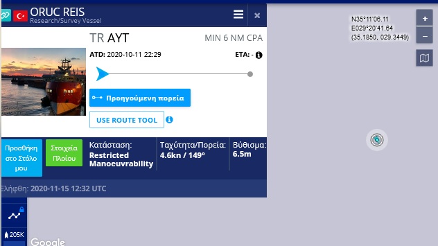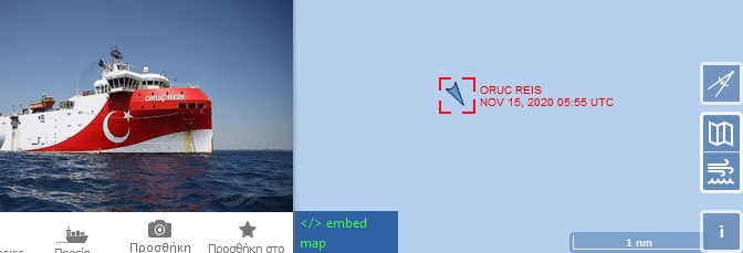 «Εξαφανισμένο» είναι το τουρκικό ερευνητικό σκάφος Oruc Reis καθώς διατηρεί τον πομπό AIS κελιστό εδώ και 33 ώρες, έχοντας δώσει τελευταία φορά στίγμα στις 15 Νοεμβρίου στις 12:32 UTC (Coordinated Universal Time).
