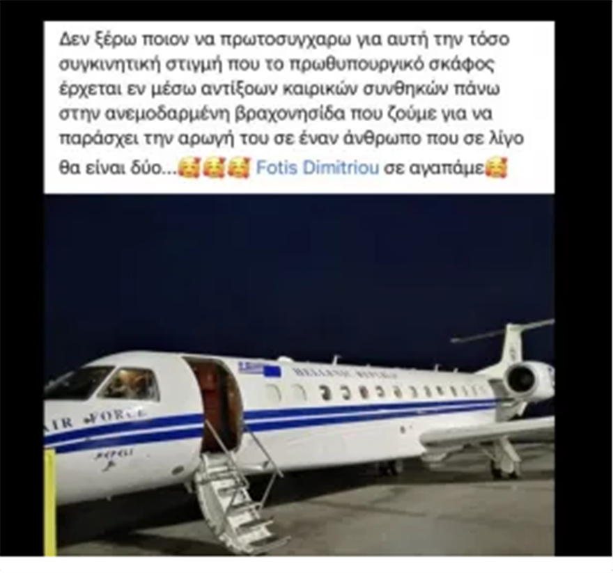 Με μια συγκινητική ανάρτηση πολίτης της Μυκόνου ευχαριστεί την ελληνική κυβέρνηση που έστειλε το πρωθυπουργικό αεροσκάφος για να παραλάβει την έγκυο από το νησί σε μια μέρα με αντίξοες καιρικές συνθήκες.