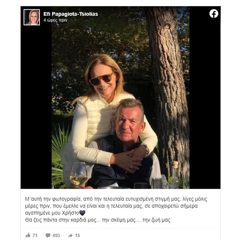 Την ίδια ώρα ραγίζει καρδιές το τελευταίο αντίο της συζύγου του. Η Έφη Παπαγιώτα ανέβασε στα social media μία κοινή φωτογραφία τους στην οποία γράφει ως λεζάντα τα εξής: «Μ´αυτή την φωτογραφία, από την τελευταία ευτυχισμένη στιγμή μας, λίγες μόλις μέρες πριν, που έμελλε να είναι και η τελευταία μας, σε αποχαιρετώ σήμερα αγαπημένε μου Χρήστο. Θα ζεις πάντα στην καρδιά μας… την σκέψη μας…. την ζωή μας”, είναι το συγκινητικό μήνυμα της συζύγου του».