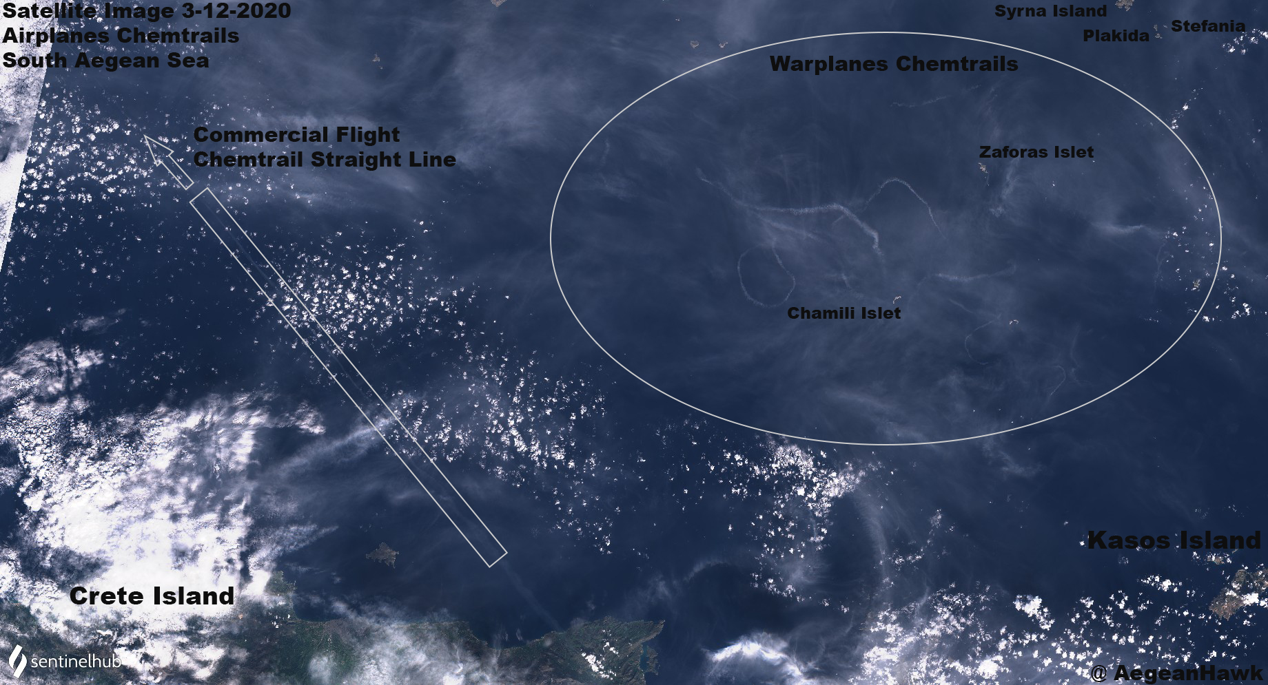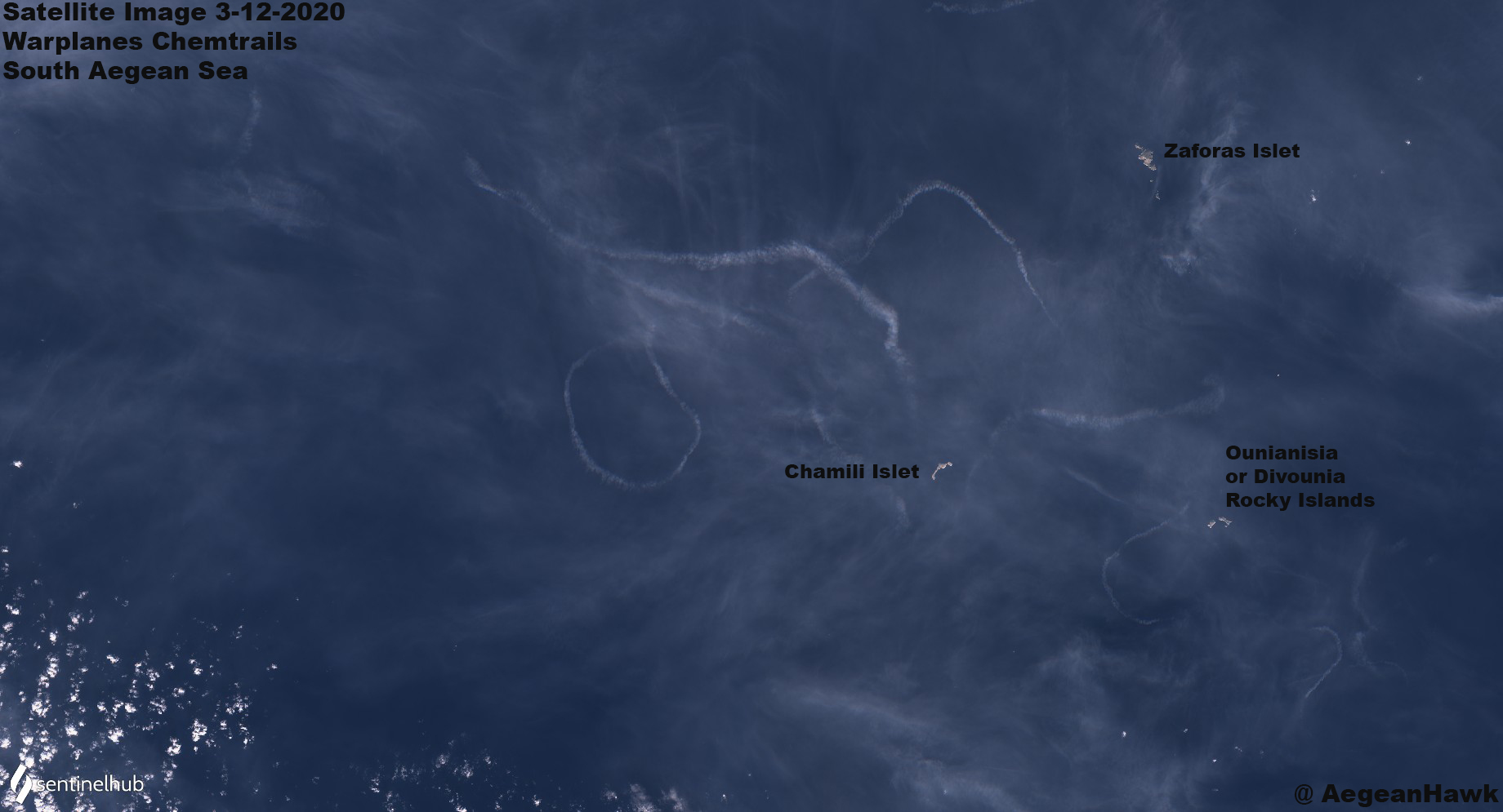 Ο @Aegeanhawk εντόπισε σε φωτογραφίες εμπορικού δορυφόρου, που κινείται πάνω από τη Μεσόγειο, contrails από ελιγμούς αεροσκαφών, που δεν μπορούν να είναι τίποτε άλλο από μαχητικά.