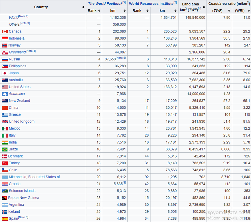 Αναζητώντας περισσότερα στοιχεία, βρήκαμε ότι και ένας παγκόσμιος, μη κερδοσκοπικός οργανισμός, το «World Resources Institute», που ιδρύθηκε το 1982 με χρηματοδότηση από το ίδρυμα MacArthur υπό την ηγεσία του James Gustave Speth, στη λίστα με τις ακτογραμμές όλων των χωρών του κόσμου, αναφέρει ότι η Ελλάδα έχει ακτογραμμή 15.147 χλμ. και η Τουρκία 8.140 χλμ. Παραθέτουμε τον σχετικό πίνακα (πηγή: WIKIPEDIA). Σ’ αυτόν, θα δείτε και τις ακτογραμμές πολλών άλλων χωρών του πλανήτη.