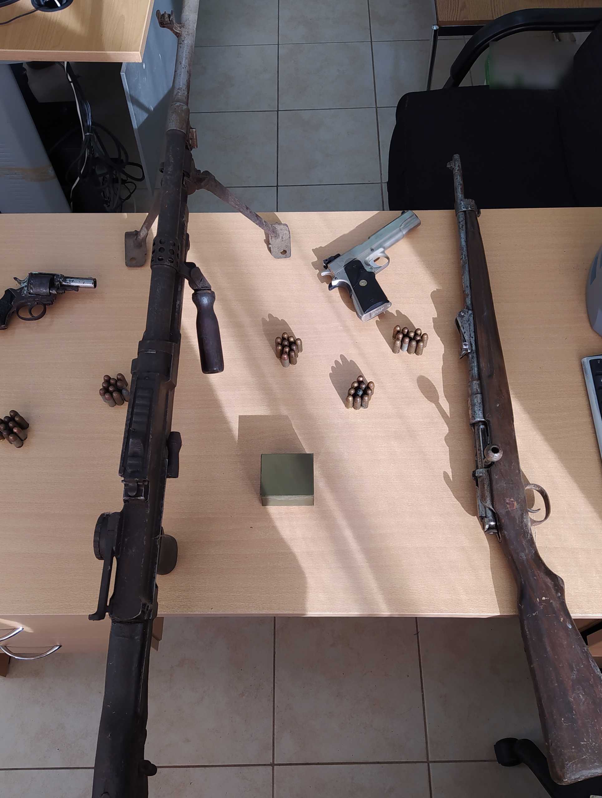 Σύμφωνα με την Αστυνομία, άνδρες της Ασφάλειας, αξιοποιώντας πληροφορίες που είχαν συγκεντρώσει, έκαναν έρευνα σε αποθήκη του συλληφθέντα, όπου βρήκαν ένα οπλοπολυβόλο στρατιωτικού τύπου- διαμετρήματος 7,62 χιλιοστών, ένα πολεμικό τυφέκιο, ένα περίστροφο, ένα πιστόλι 0,4 χιλιοστών, ένα κυνηγετικό όπλο και 50 φυσίγγια των 0,45 χιλιοστών.