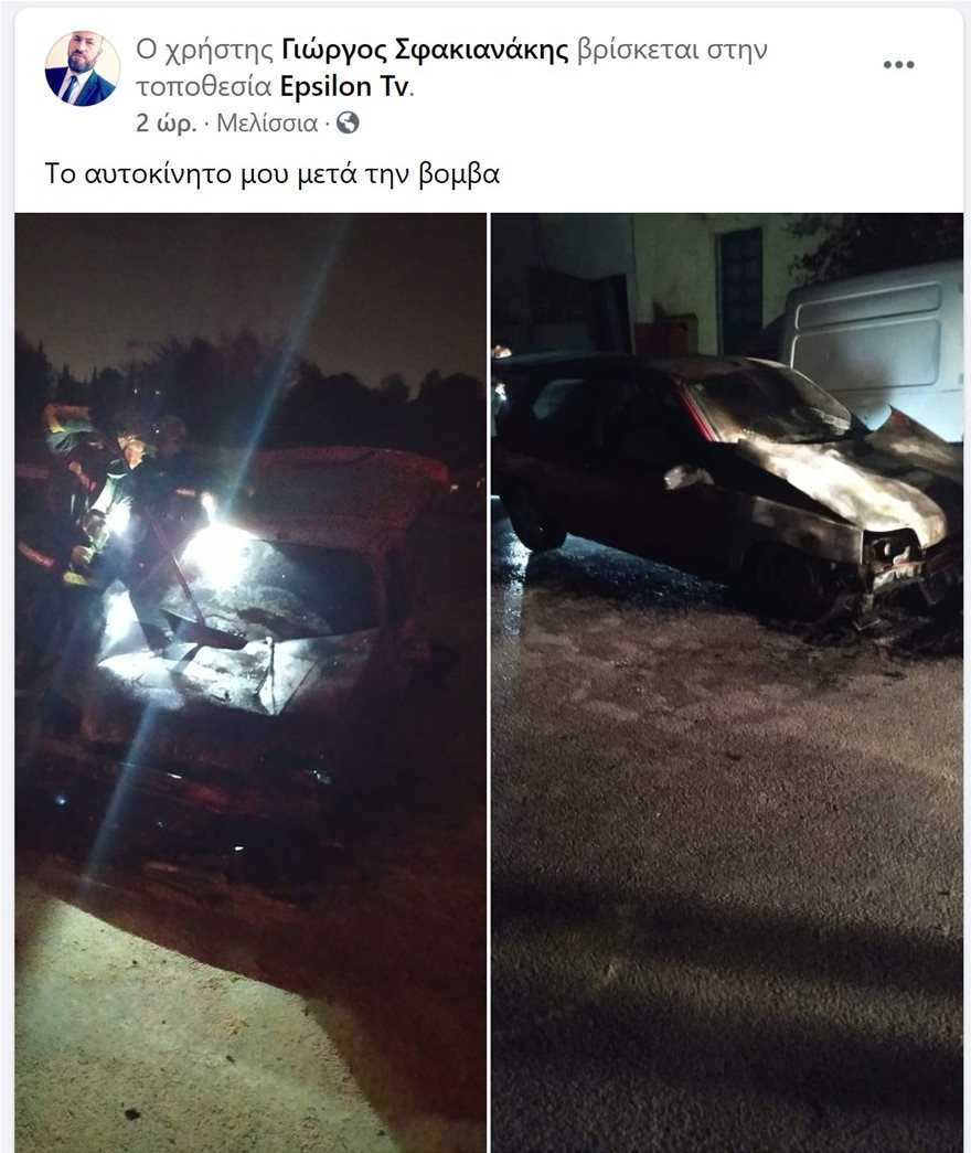 Πρόκειται πιθανόν για εκρηκτικό μηχανισμό που είχε τοποθετηθεί στο Ι.Χ του δημοσιογράφου και υπαλλήλου του σταθμού «E», Γιωργου Σφακιανακη, ο οποίος την δεδομένη χρονική στιγμή συντόνιζε την εκπομπή του Μένιου Φουρθιώτη «Αποδείξεις Live».