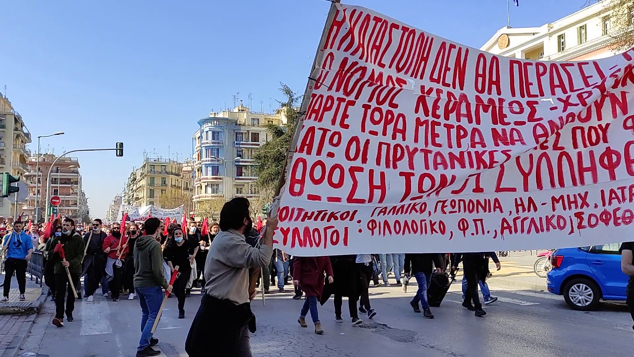Λίγο πριν ολοκληρωθεί η πορεία των φοιτητών στη Θεσσαλονίκη το μεσημέρι της Πέμπτης, ομάδα κουκουλοφόρων πέταξε βόμβες μολότοφ εναντίον αστυνομικών των ΜΑΤ.