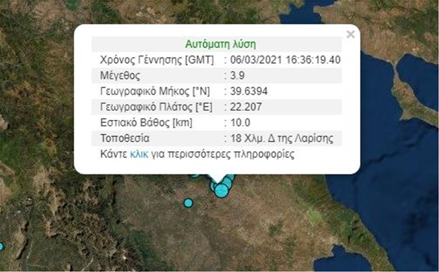 Στις 18.36 σημειώθηκε ένας ακόμη μετασεισμός μεγέθους 3,9 βαθμών της κλίμακας Ρίχτερ με επίκεντρο 18 χιλιόμετρα δυτικά της Λάρισας, στο σημείο όπου παρουσιάζεται έντονη δραστηριότητα εδώ και τρία εικοσιτετράωρα.