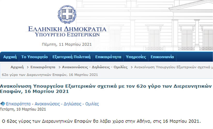 Διερευνητικές επαφές, όπως παγίως αποκαλούνται οι άτυπες αυτές διαβουλεύσεις, ανακοίνωσε το ελληνικό υπουργείο Εξωτερικών.